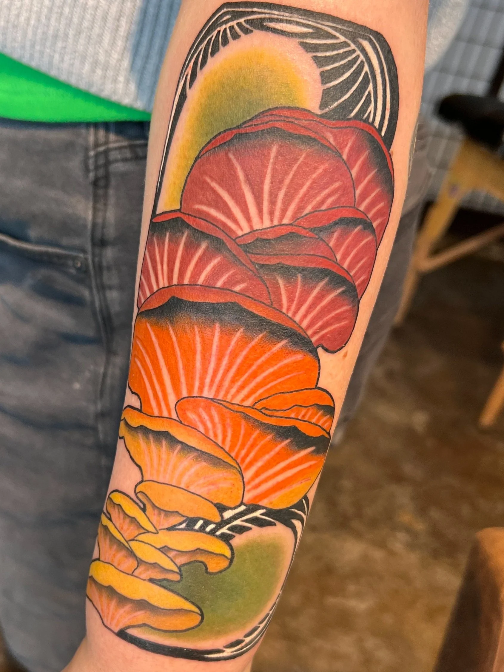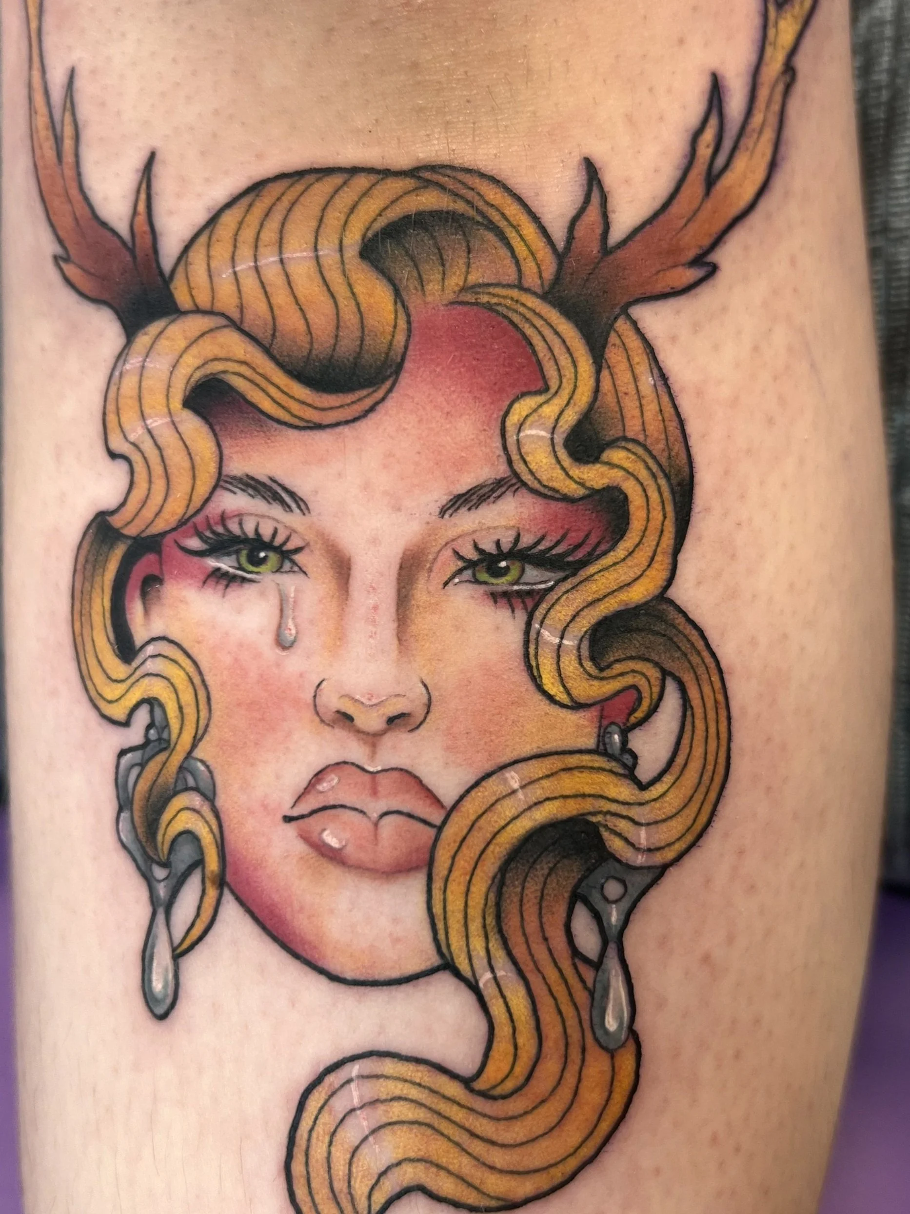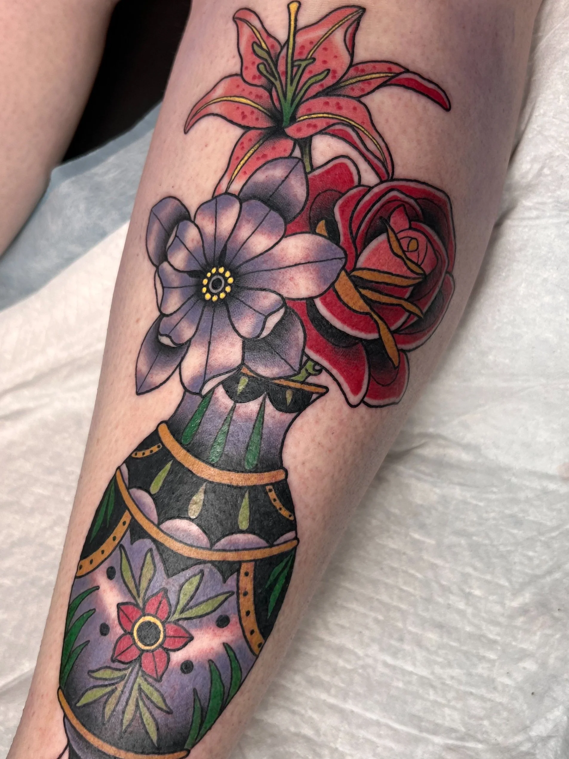A style that includes a mix of thick and thin line work to create a dynamic image. Full of color and slightly more detailed than average Traditional tattoos.